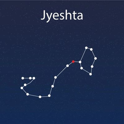 The People born in Jyeshta Nakshatra in Astrology are born for great work. The meaning of the word 'Jyeshta' is elder, senior, first, or the chief. Yogathara of Jyeshta is Antares. Antares is the brightest, most massive, and the most evolved stellar member of the nearest OB association. Antares is nearing the end of its lifespan and is expected to explode as a supernova in the next million years. Even in this sense, the name Jyeshtha or elder is appropriate. Jyeshta is the eldest of 27 sisters. She felt betrayed and jealous because Soma, their husband, favoured Rohini, who is younger than her.
